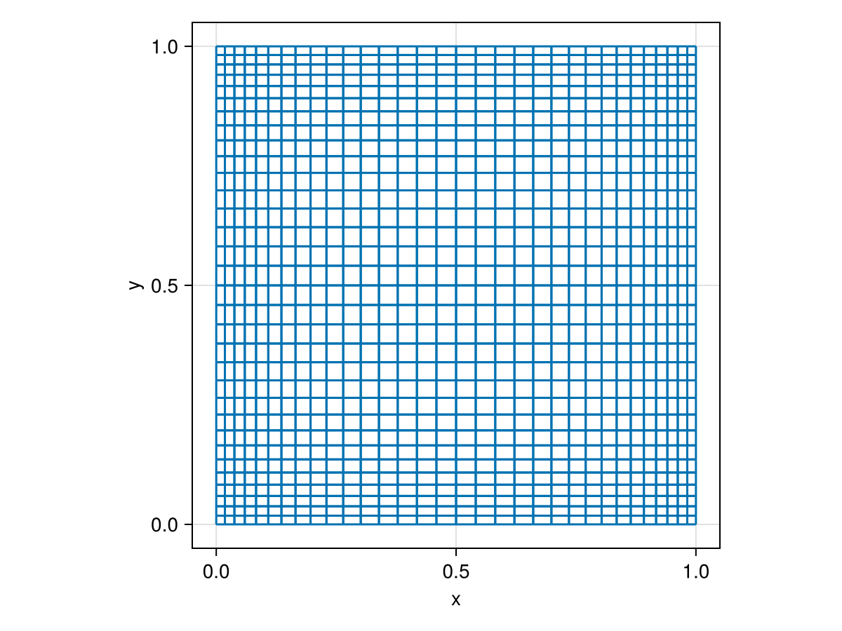 ))(u = ((DirichletBC{Nothing}(nothing), DirichletBC{Nothing}(nothing)), (DirichletBC{Nothing}(nothing), DirichletBC{Tuple{Float64, Float64}}((1.0, 0.0)))),)We create a two-dimensional domain with a box of size [1, 1]. The grid is created as a Cartesian product between two vectors. We add a refinement near the walls.