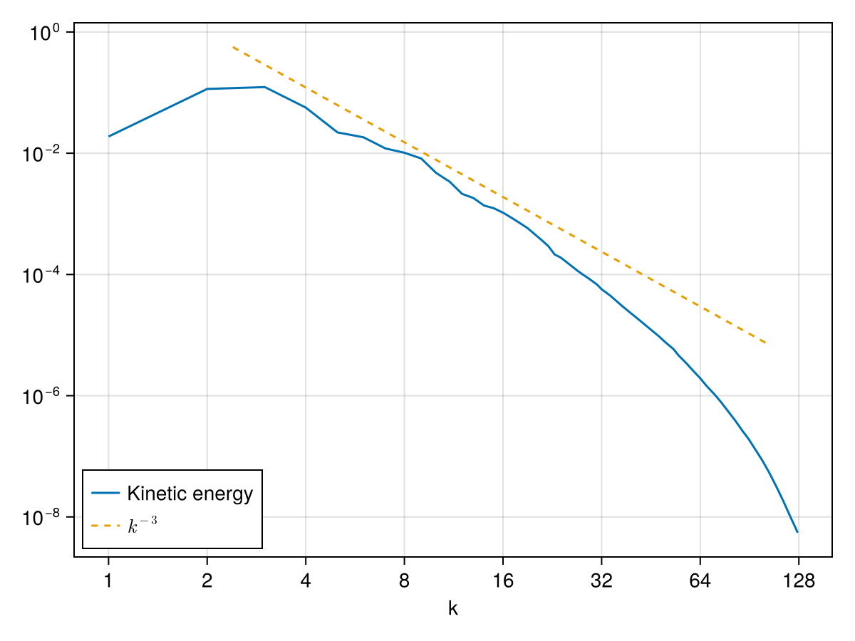 In this example we consider decaying homogeneous isotropic turbulence, similar to the cases considered in [1] and [2]. The initial velocity field is created randomly, but with a specific energy spectrum. Due to viscous dissipation, the turbulent features eventually group to form larger visible eddies.